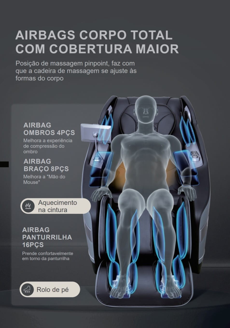 Equipada com múltiplos programas automáticos de massagem, sistema de aquecimento lombar e rolos 3D de alta performance, ela atua em profundidade, promovendo alívio muscular, redução do estresse e melhora na qualidade do sono.