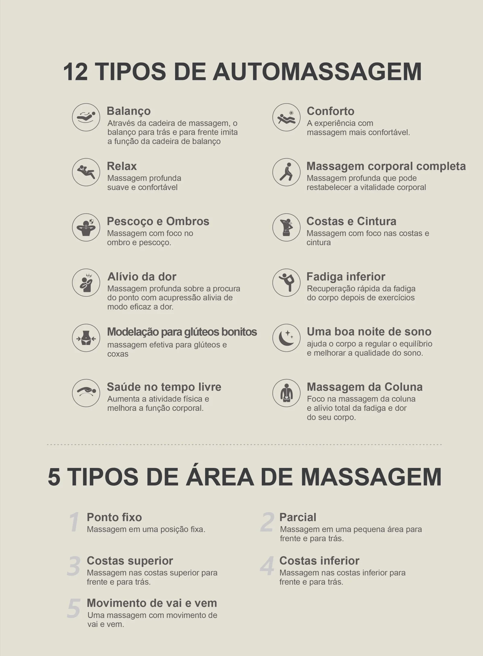 Massagem 3D em áreas estratégicas (costas, ombros, glúteos, pernas e pés)