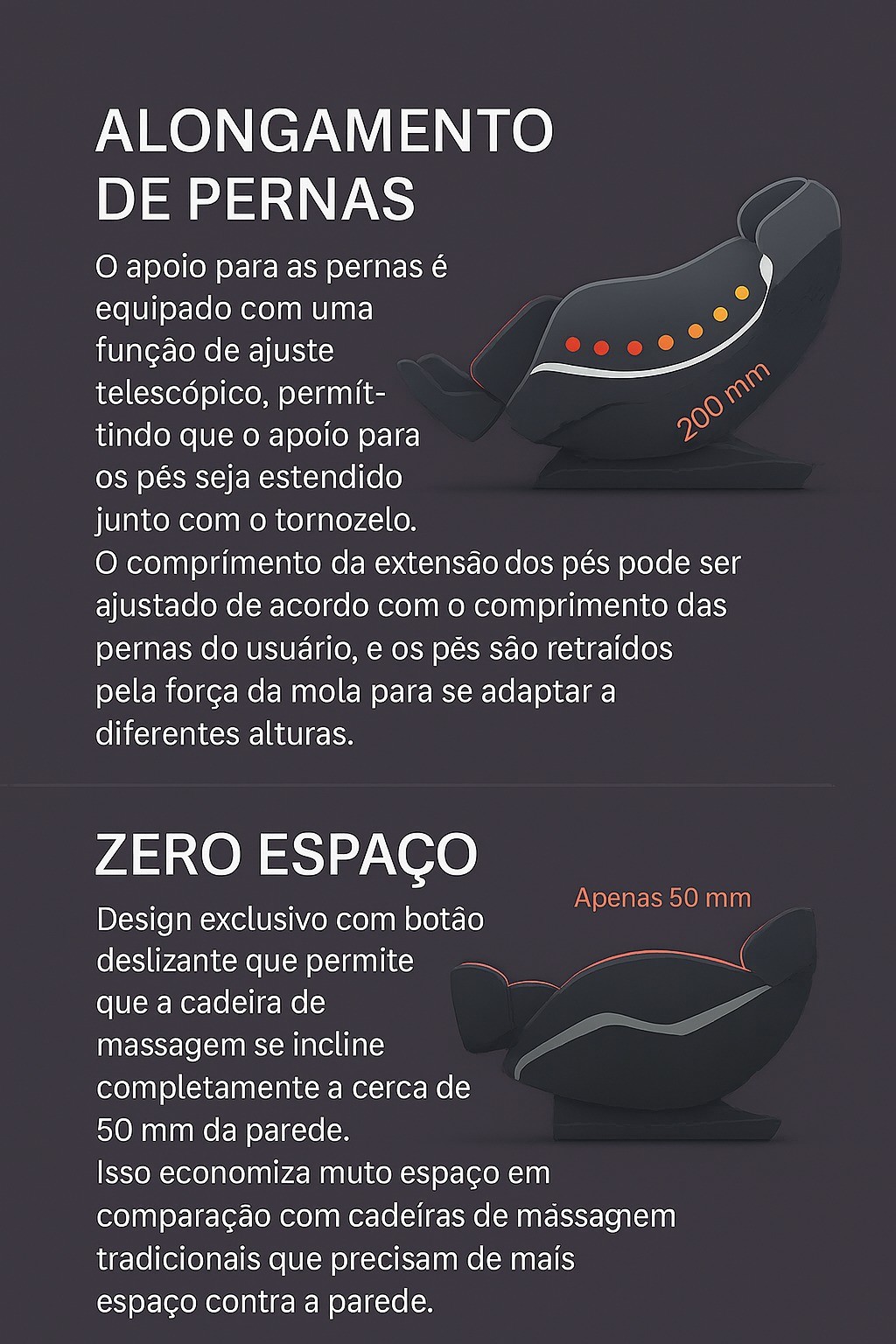 Com o exclusivo sistema de Gravidade Zero, esta poltrona distribui seu peso de forma uniforme, reduzindo a pressão sobre a coluna e melhorando a circulação sanguínea. Esta posição otimiza o relaxamento, reduz a tensão muscular e cria uma sensação de leveza que maximiza os benefícios da massagem.