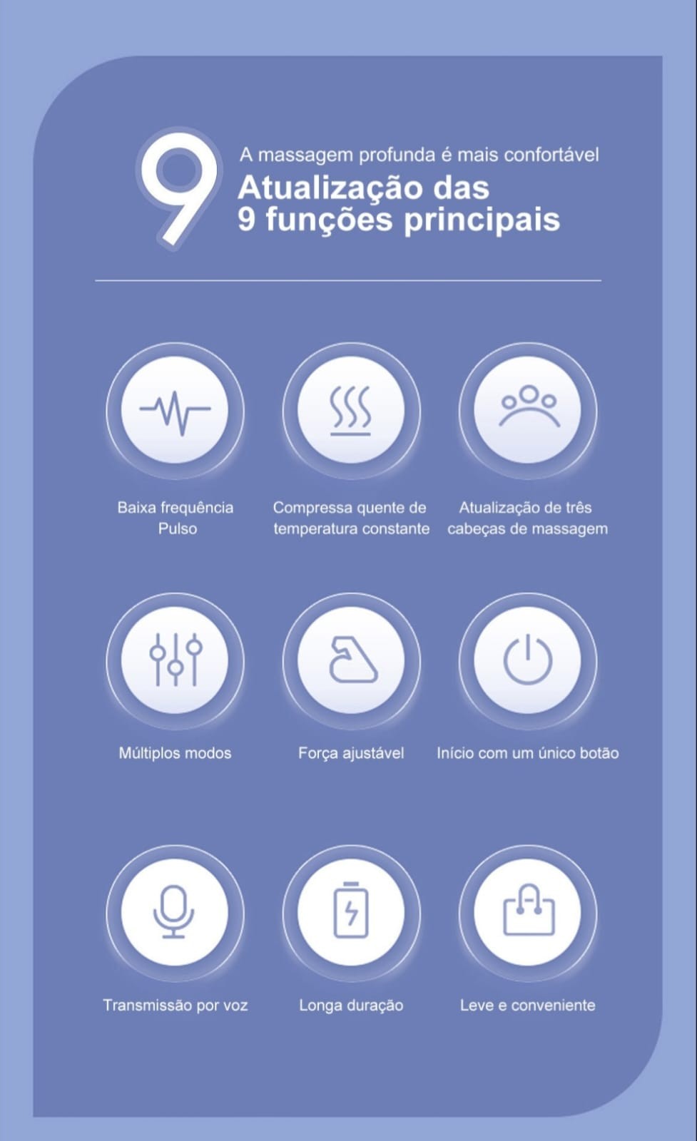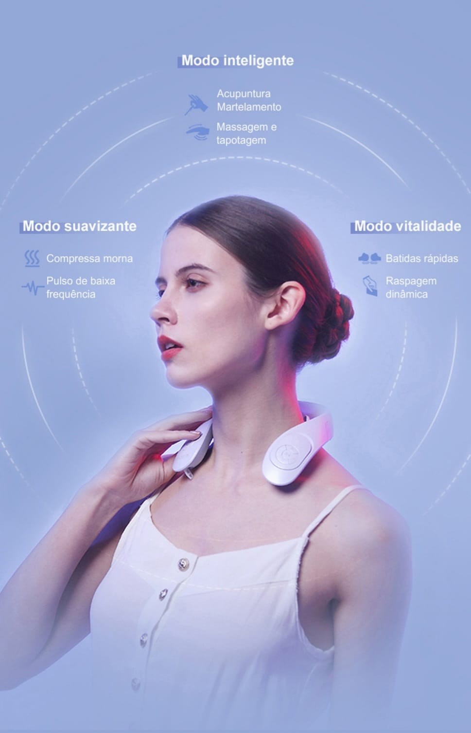 Inclui modos como massagem por pulso, compressa morna, batidas rápidas e raspagem dinâmica para um alívio completo.